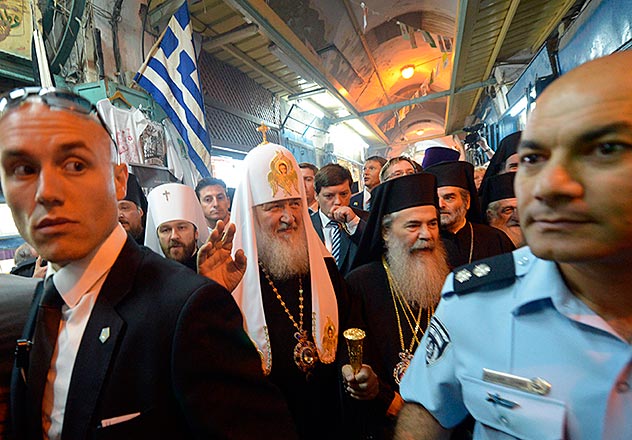 ロシア正教会の最高指導者であるキリル総主教(中央左)と、エルサレムのフェオフィル三世総主教(その 右)が、エルサレムの復活教会(聖墳墓教会)に向かう。キリストが磔にされたゴルゴタの丘は、この教会の場所にあったとされ る。 セルゲイ・ピャタコフ/ロ シア通信撮影