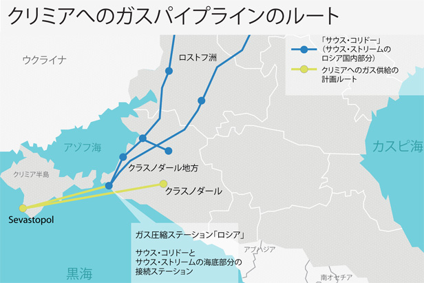ロシア連邦エネルギー省の関係筋が「ヴェドモスチ」紙にこれを伝えた。1案目はクラスノダルからセヴァストポリに、400キロメートルのパイプラインを建設するもの。その能力は年間100億立法メートルで、費用は10億ドル弱。2案目のアナパ(「サウス・ストリーム」の起点)からのパイプラインは100キロメートルで、費用が2~3億ドルとより安くなっている。圧縮ステーション「ルスカヤ」(アルカディ・ロテンベルク氏の「ストロイガスモンタシュ」社が建設中)から、または圧縮ステーション「カザチヤ」(ゲンナディ・ティムチェンコ氏の「ストロイトランスガス」社が建設中)からパイプラインが引かれる可能性がある。