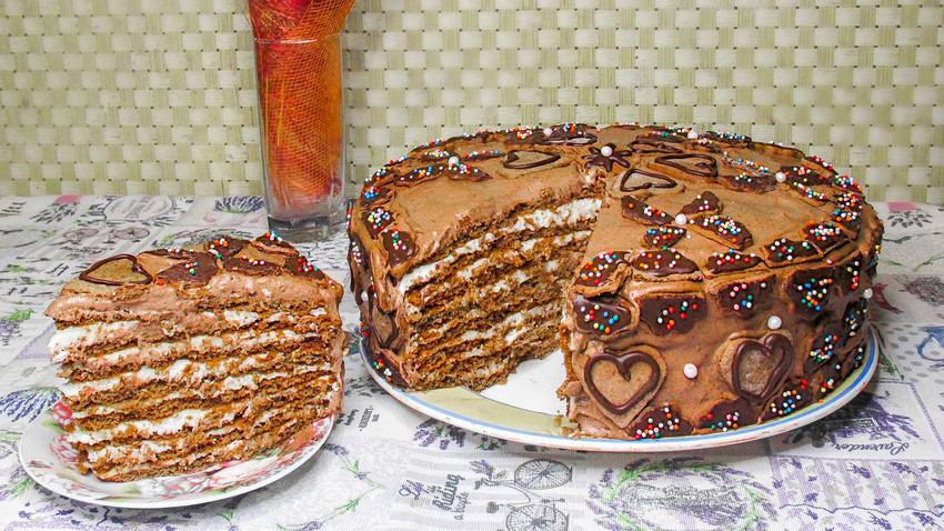 5. ほんのり甘く、ほんのりハチミツとチョコレートの風味がする最高のケーキの出来上がり。プリャーニクが入っているので少しカリカリしていて、ハチミツの匂いがたまらない。