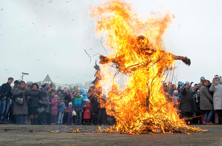 3月17日ウラジオストク。マースレニツァ(謝肉祭)の最終日に、昔からの慣わしにしたがい、藁人形を焼いて冬 送りをする。 =ユーリー・マルツェフ/ロイター通信撮影