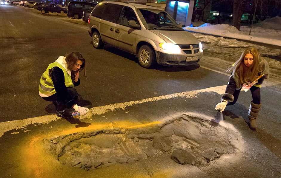「ロシアに二つの災難あり―アホと悪路だ」。運動「怒れる市民」の参加者たちが、道路の穴ぼこに色を塗る。 =マクシム・ブリノフ/ロシア通信撮影