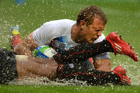 6月30日、モスクワ。ラグビー(7人制)のワールドカップ(W杯)で、 男子の日本代表と ロシア代表が、下位チームによる順位決定戦で再び対戦し、ロシアが27-5で圧勝した。 写真はロシアのデニス・シムプリケヴィチ選手。 =ラミル・シトディコフ/ロシア通信撮影