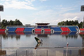 2013年9月1日、ハバロフスク。地元のサッ カークラブСSKAエネルギアのホームアリーナ「レーニンスタジアム」が、洪水で冠水。そこで男性がウィンド サーフィンをする。 =ウラジーミル・バルスコフ/ロイター通信撮影