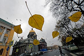 2013年10月23日。サンクトペテルブルクの聖イサアク大聖堂前。車の窓ガラスに付着した葉。=ロイター通信/アレクサンドル・デミヤンチュク