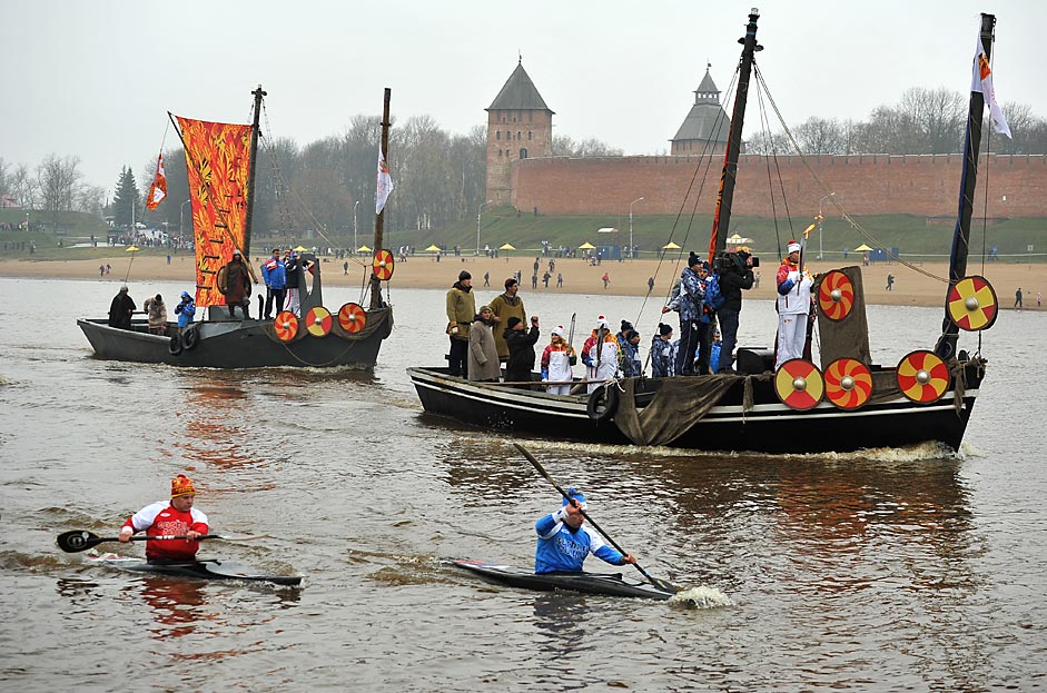 10月24日、ソチ五輪の聖火を迎えるセレモニーが、古都ノヴゴロドから数キロの、ヴォルホフ川右岸にある「リューリク集落(ヒルフォート)」で行われた。これは9世紀の遺跡で、ロシア北西部に位置するノヴゴロドは、広大な後背地からあがる毛皮と中継貿易で繁栄を極めた。=タス通信/ルスラン・シャウモコフ撮影