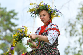 7月5日、チェリャビンスク州で、古代よりスラブ圏に伝わるイワン・クパーラ祭が行われ、女性が花輪を編む。これは、夏至の豊穣祭で、前夜には魔女と悪霊が「禿山」で夜宴を開くという。=アレクサンドル・コンドラチュク/ロシア通信撮影
