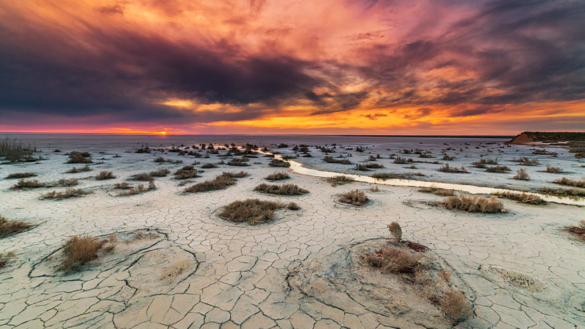 ヨーロッパ最大で、世界でも最も大きな塩湖の一つであるエリトン湖は、ロシア南部、カザフスタンとの国境近くにある。
